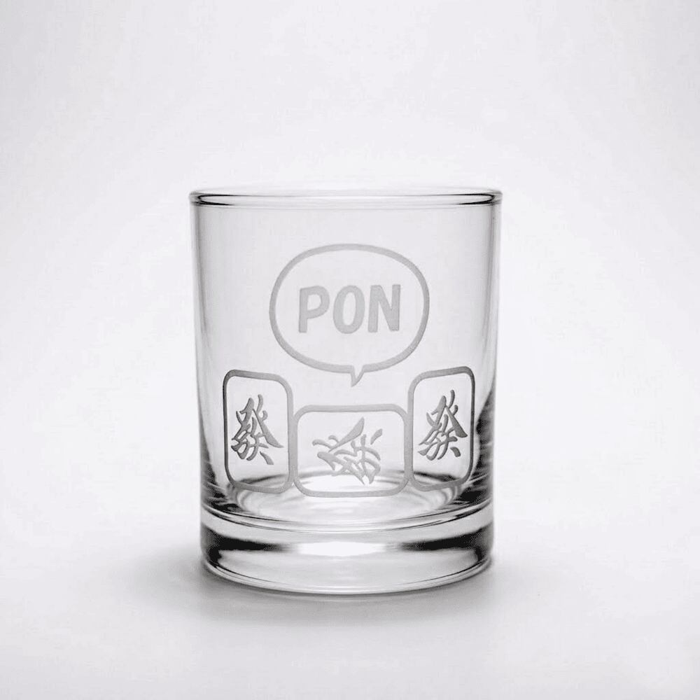 「ポン!」された麻雀牌のイラストを、サンドブラスト技法でグラスに丁寧に彫刻。