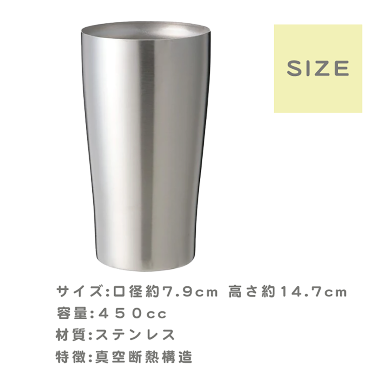 耐久性の高いステンレス素材(サイズ:約7.9cm×14.7cm / 容量:450ml)を使用。彫刻はサンドブラスト技法で行い、長く美しい仕上がりに。