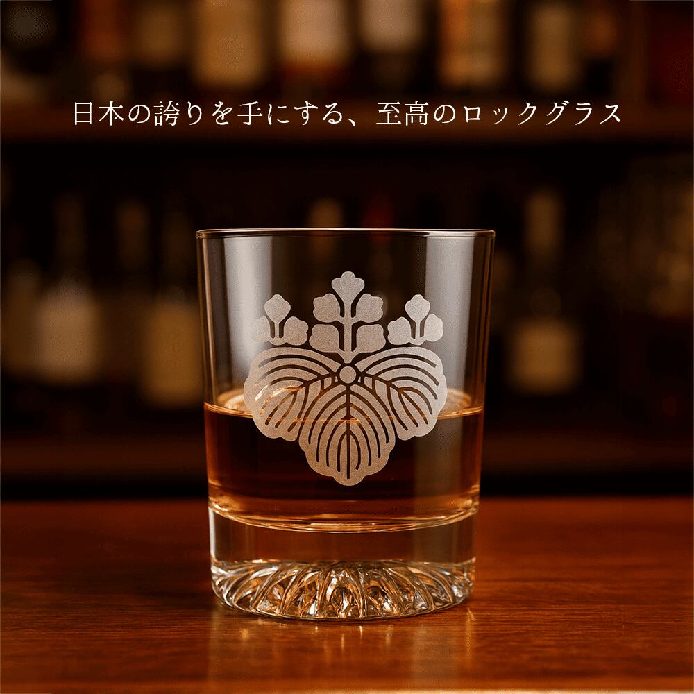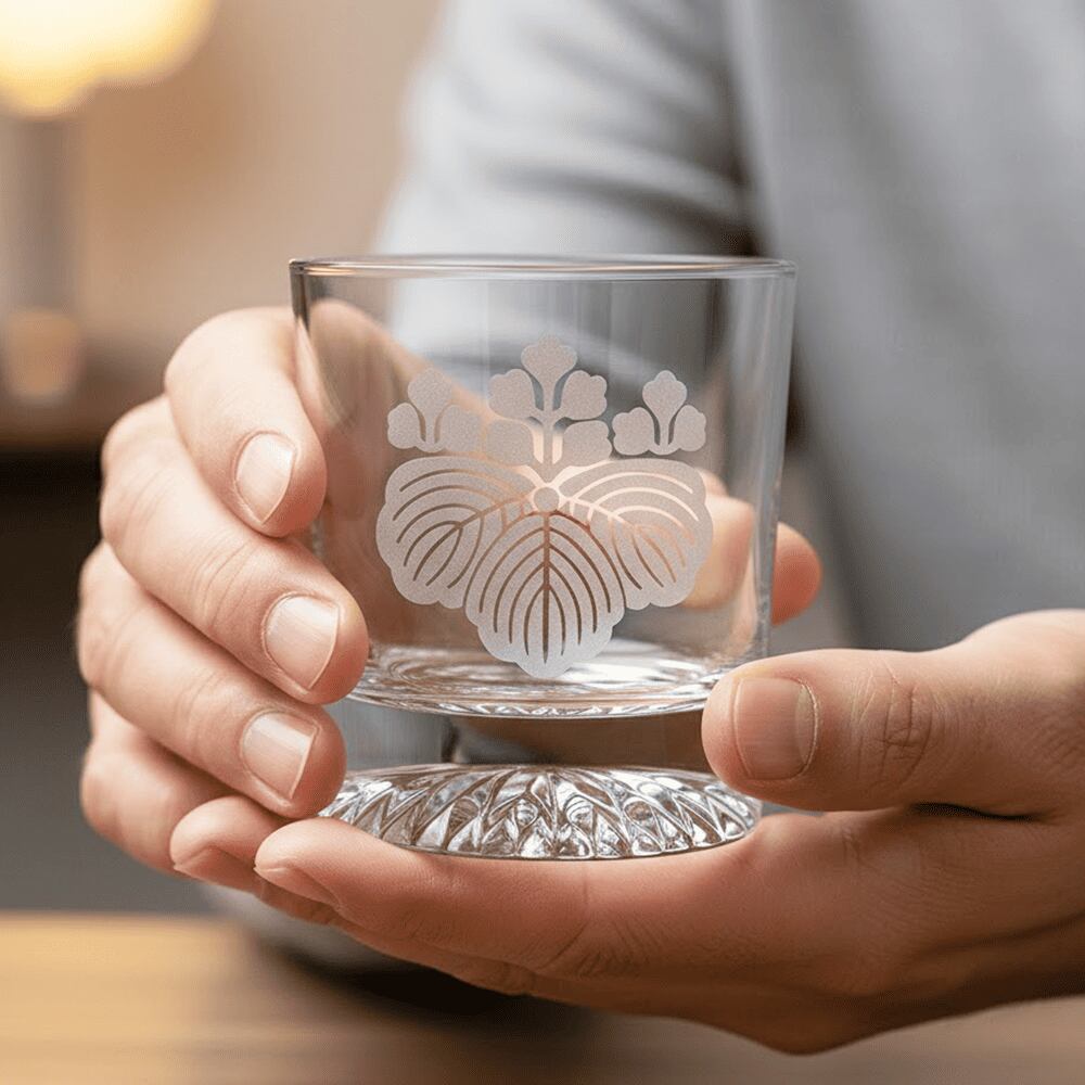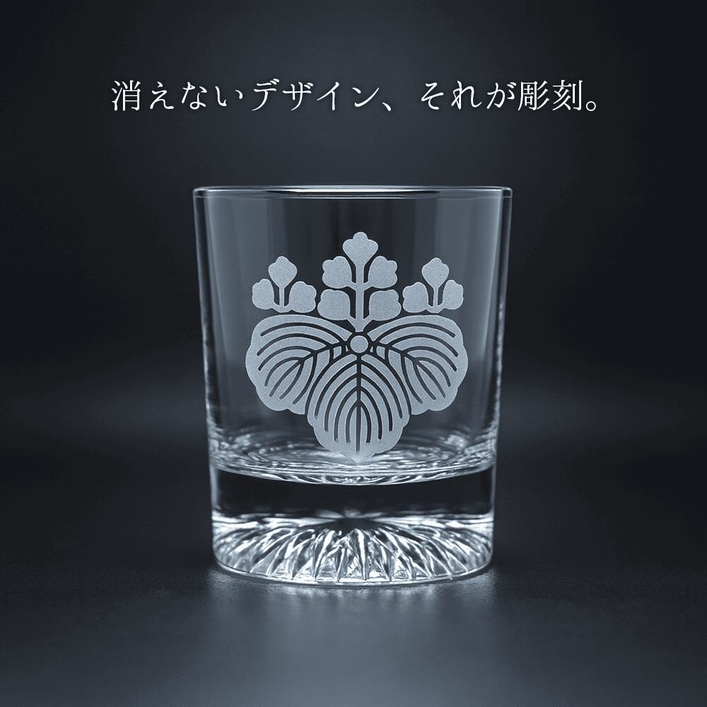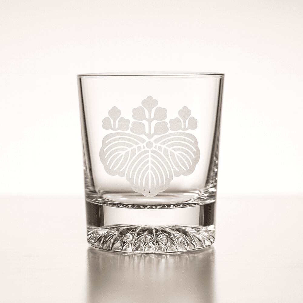 その象徴ともいえる家紋 「五七桐(ごしちのきり)」 を、重厚感あるロックグラスに美しく彫刻しました。