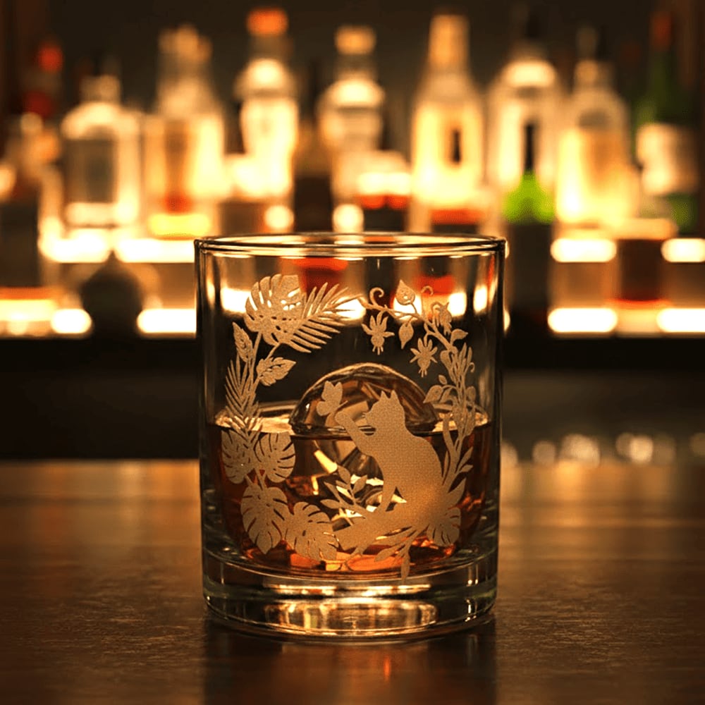 ウイスキーや焼酎を注げば、琥珀色の液体とともに猫と蝶が幻想的に浮かび上がります。