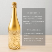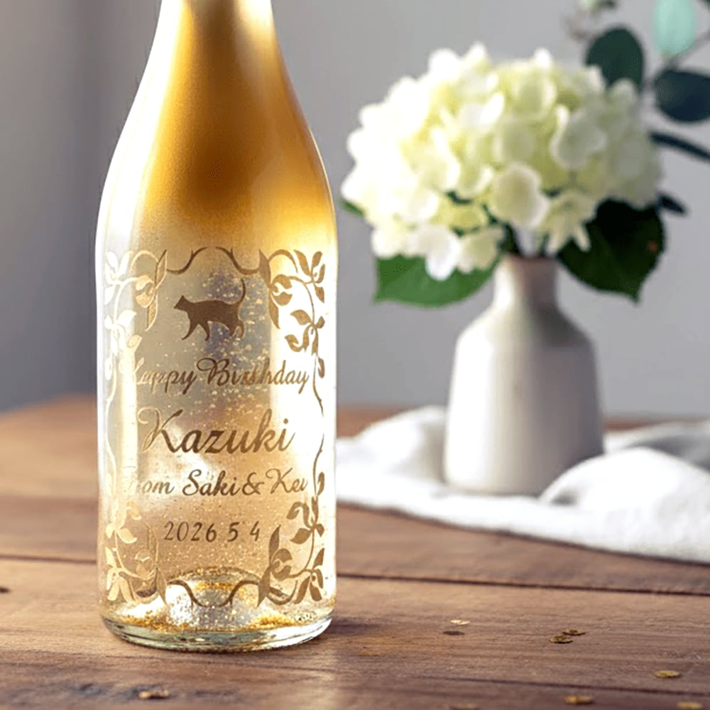 24金の金箔舞うスパークリングワインに、名前やメッセージを丁寧に彫刻し、華やかに輝く一本へと仕上げます。