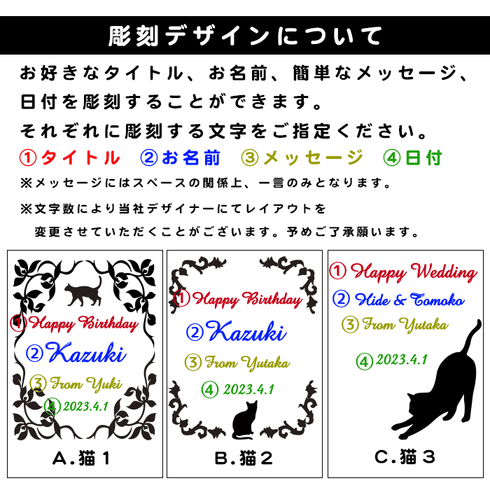 猫フレームは3種類、フォントも選択可能。さらにゴールド・シルバー・ピンクの彫刻カラーで、贈る相手に合わせた特別な一本に。