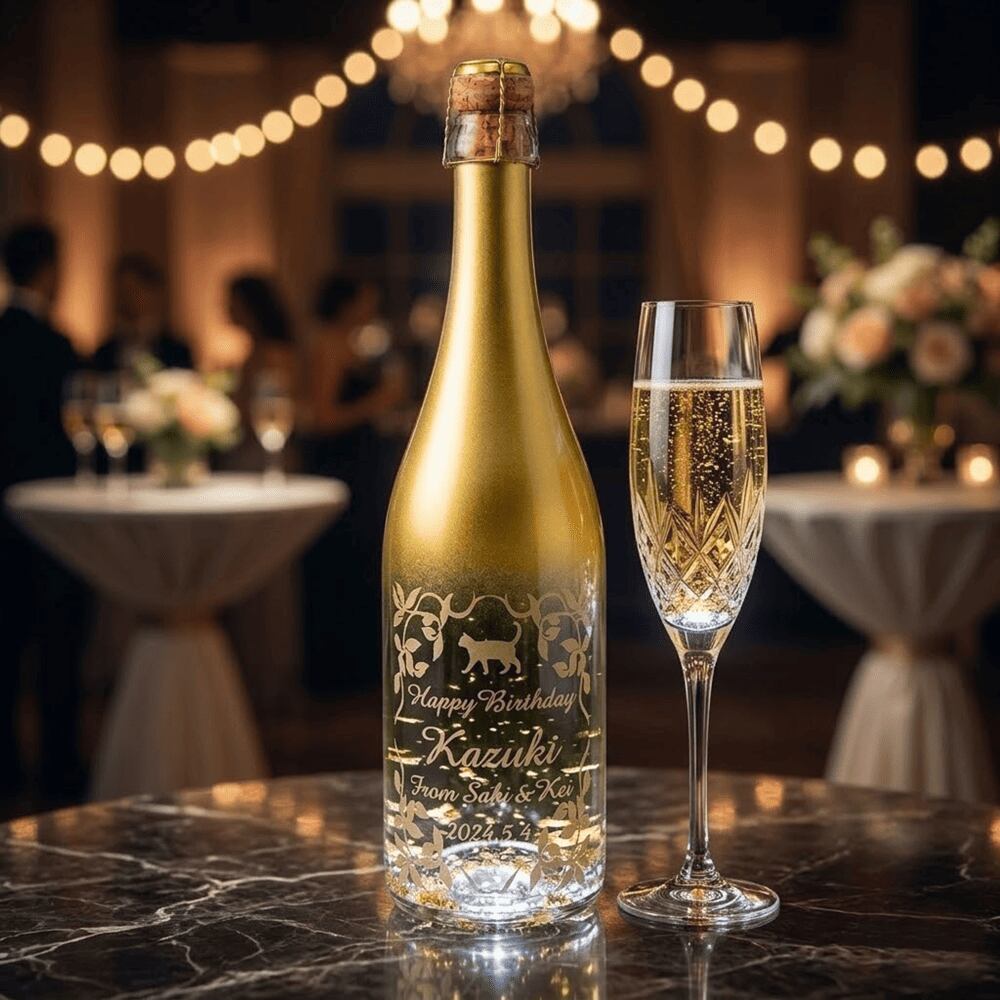 グラスに注ぐたび、光と金箔が思い出を輝かせる特別な一本。大切な人へ贈る名入れスパークリングワインギフトとして、心に残る時間を届けてみませんか。