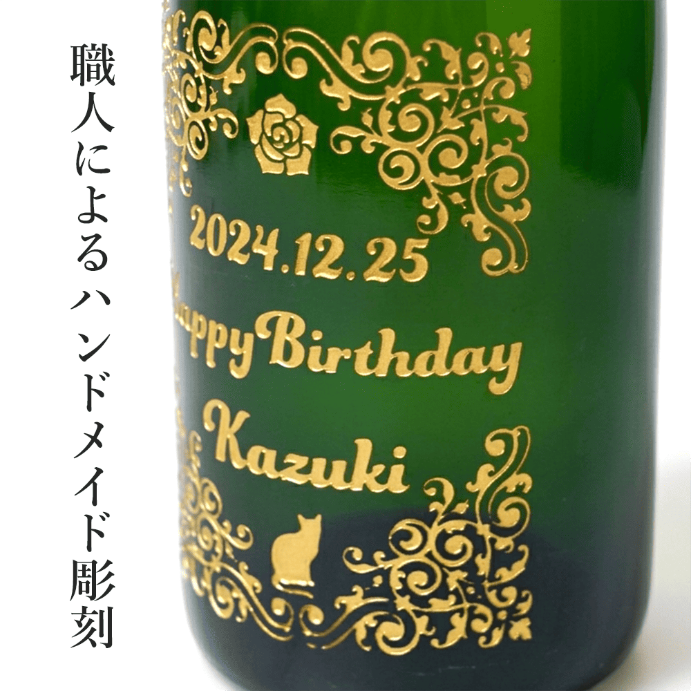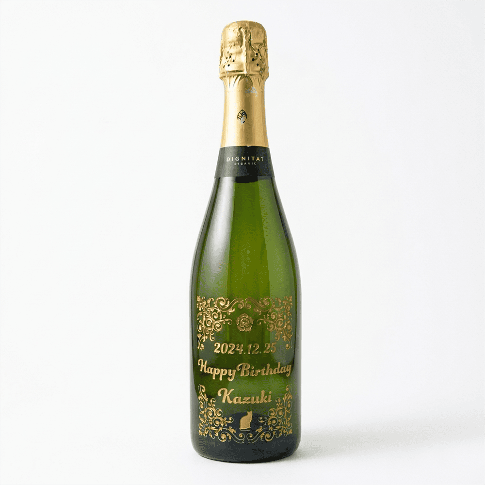 スペイン産オーガニック・スパークリングワインをベースに、サンドブラスト技法でお名前やメッセージに加え、猫のシルエットを丁寧に彫刻いたします。