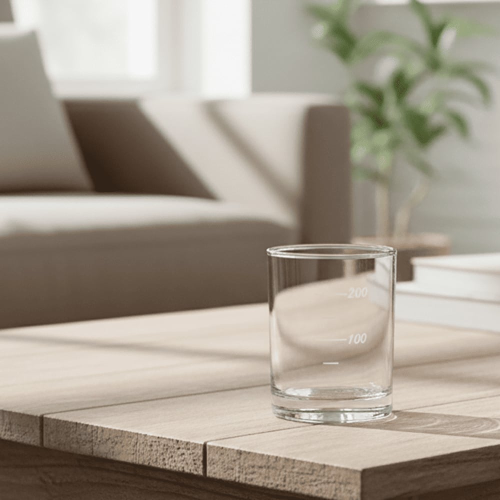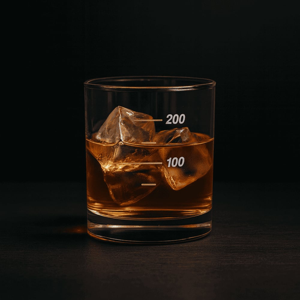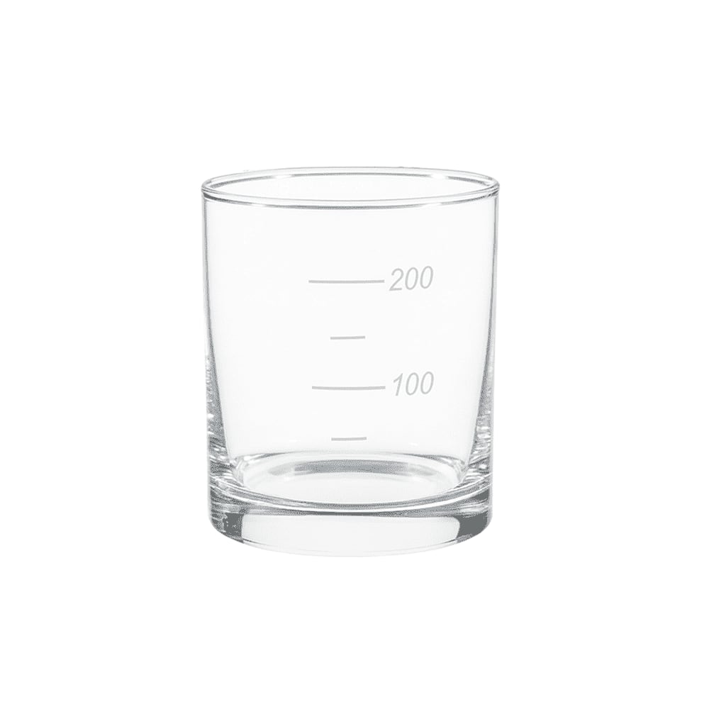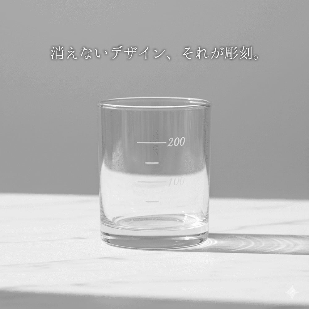 グラスの表面には、サンドブラスト技法で精密に彫刻された目盛り。
